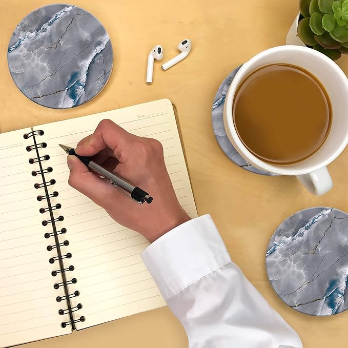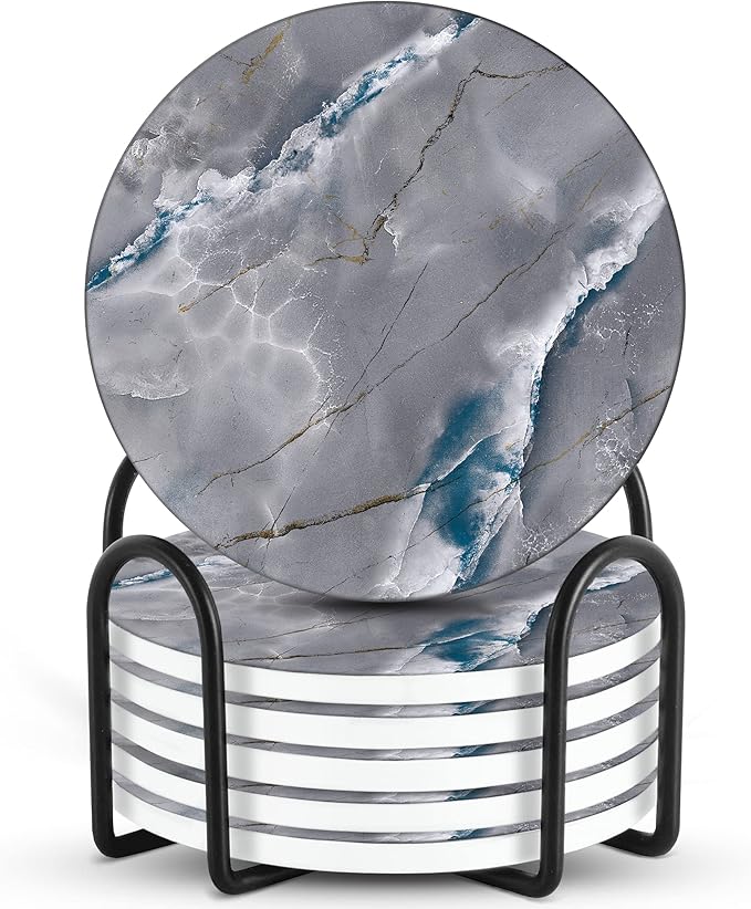 Emerson Coasters for Drinks Absorbent – Natural Stone Drink Coasters Set with Holder, Coasters for Coffee Table, Wooden Tabletop Protection Marble Style – 100% Heavy Duty Set of 6 (Graphite)
