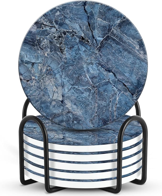 - SOLID NATURAL CERAMIC MATERIAL – Our coasters for drinks are handcrafted with all natural 100% ceramic and cork. The set includes 6 stone coasters with cork bottoms and 1 sleek storage rack that can neatly stack your coasters. Perfect for wet glasses, hot coffee or tea, and preventing ring stains on coffee tables or counter tops.
