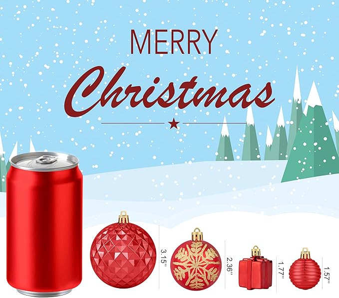 - 【Christmas Ball Ornaments】 This red and gold Christmas ornament set contains 116PCS of Christmas balls in 18 styles, includes various shapes, sizes, such as 1.57” / 2.36” / 3.14” Christmas ball, stocking , bell, and gift. It's your call to complete your Christmas decoration with these beautiful balls ornaments set, and make the Christmas season more memorable and unique