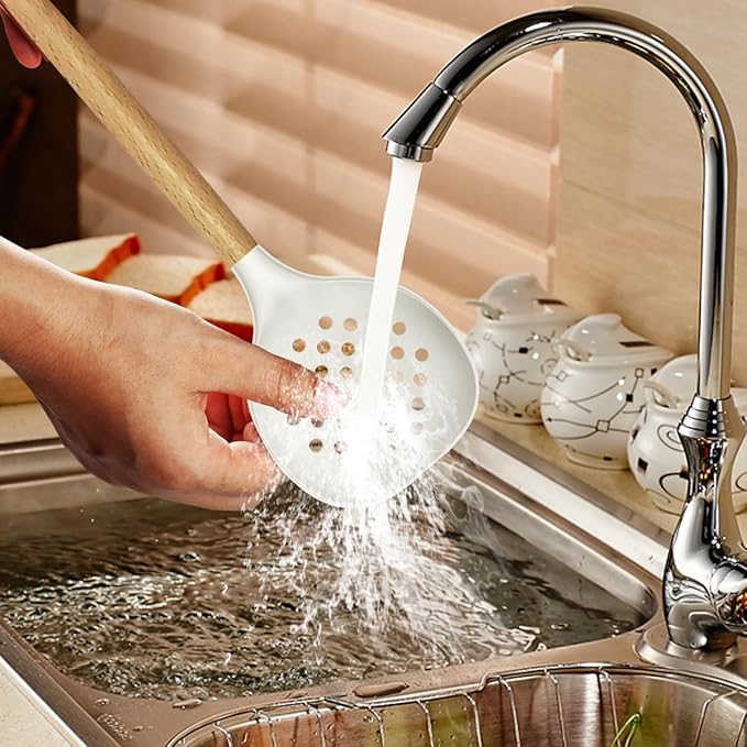 - STURDY & EASY TO CLEAN – With a reinforced stainless steel core, this silicone cooking utensils set is sturdier, resisting breakage. Seamless silicone wrap prevents food buildup for easy cleaning, friendly to non-stick cookware. Heat-resistant wooden handles with hanging holes enable easy storage, saving kitchen space