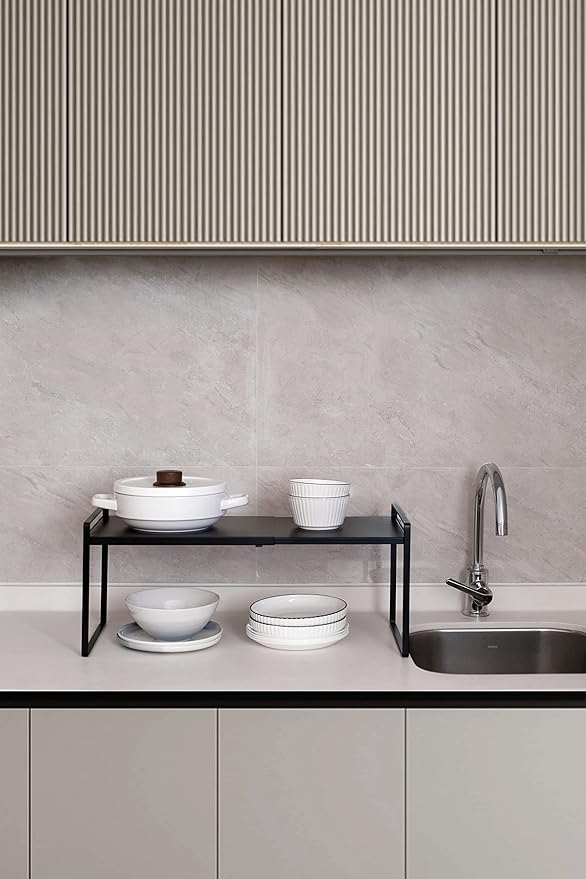Nxconsu Expandable Cabinet Shelf Organizer Riser for Kitchen Pantry Cupboard Under Sink Countertop Home Storage Organization Rack Space Saver Freestanding Heavy Duty Nonslip Stackable Black Large