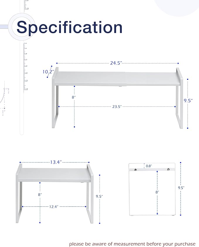 - EXPANDABLE: You may expand the width of this freestanding cabinet shelf to your desires. It can easily vary from 13.4 inches to 24.5 inches in width depending on how you want to organize your space. Specification: 10.3’’D * 13.4-24.5’’W * 9.5’’H