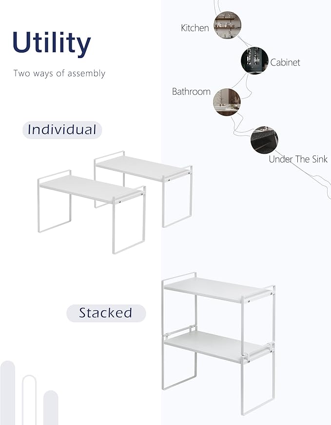 - STACKABLE: The product comes with two sets of cabinet shelves where you can stack one on top of another, creating 2-tiers double space to store household items under, in between or on the shelf. They are perfect to use as storage organizers in kitchen, cabinet, pantry, cupboard, and anywhere in your home or office for that wonderful extra storage space.