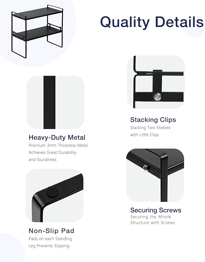 - STACKABLE: The product comes with two sets of cabinet shelves where you can stack one on top of another, creating 2-tiers double space to store household items under, in between or on the shelf. They are perfect to use as storage organizers in kitchen, cabinet, pantry, cupboard, and anywhere in your home or office for that wonderful extra storage space.