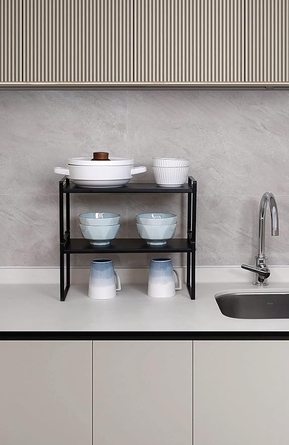 - CHARACTER DESIGN: This cabinet shelf can create plenty of space for your household items such as cups, pots, bottles, bowls, cookware, or canned foods without dominating space in your cabinet. This stylish cabinet shelf fits neatly on the countertop to keep your essentials organized and easily accessible.