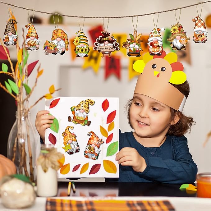 - New Designed Thanksgiving Gnome Wooden Ornaments -- 24 PCS gnome wooden slices with exquisite workmanship in 12 different styles are made of high-quality wood, painting in front and empty at back.
