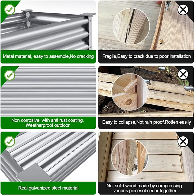 - Multipurpose: The galvanized raised garden bed is durable and strong load-bearing, it can provide ample growing space for plants. We can use it to grow vegetables, fruits and herbs. This metal raised beds for gardening can be used both indoors and outdoors, it is suitable for gardens, backyards, balconies and other places.