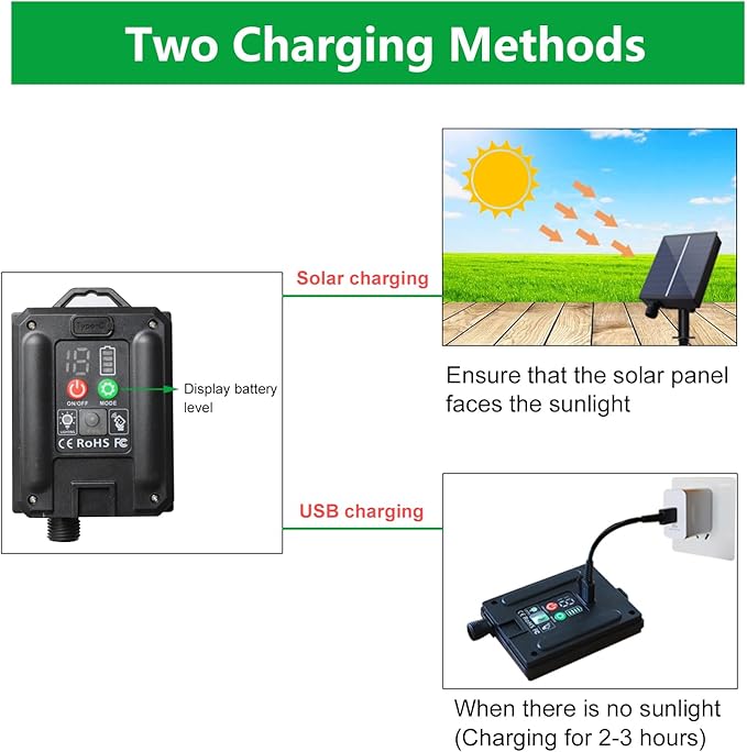- 1.Solar Net Lights - The net light has an upgraded solar panel, which can be used for outdoor decoration for a longer time. Just press the button to turn on the light, it will automatically charge during the day, and then turn on automatically when it's dark.