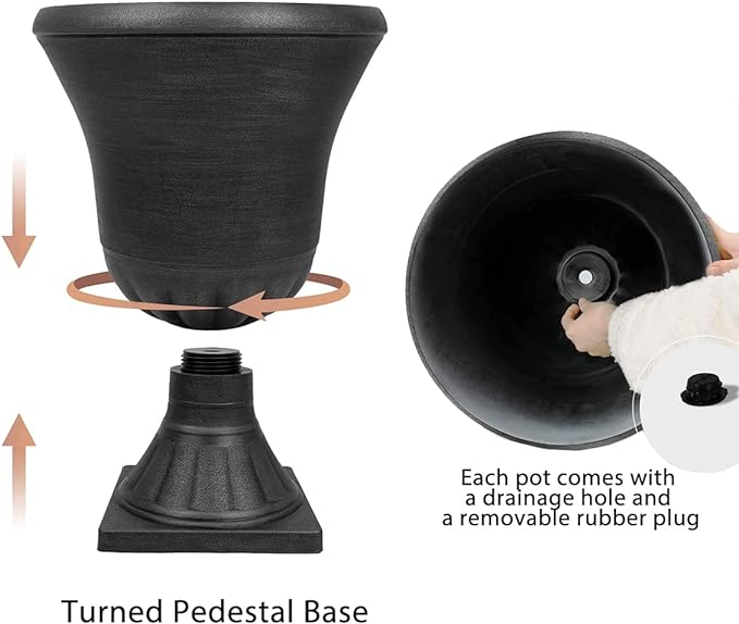 - Optional Drainage System: These urn planter comes with a drill hole in the bottom to drain the stagnant water, also with a removable rubber plugs to store the water needed by your plants