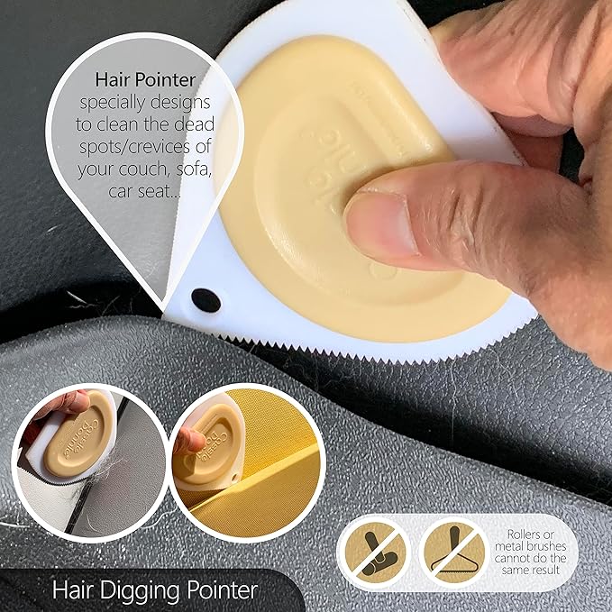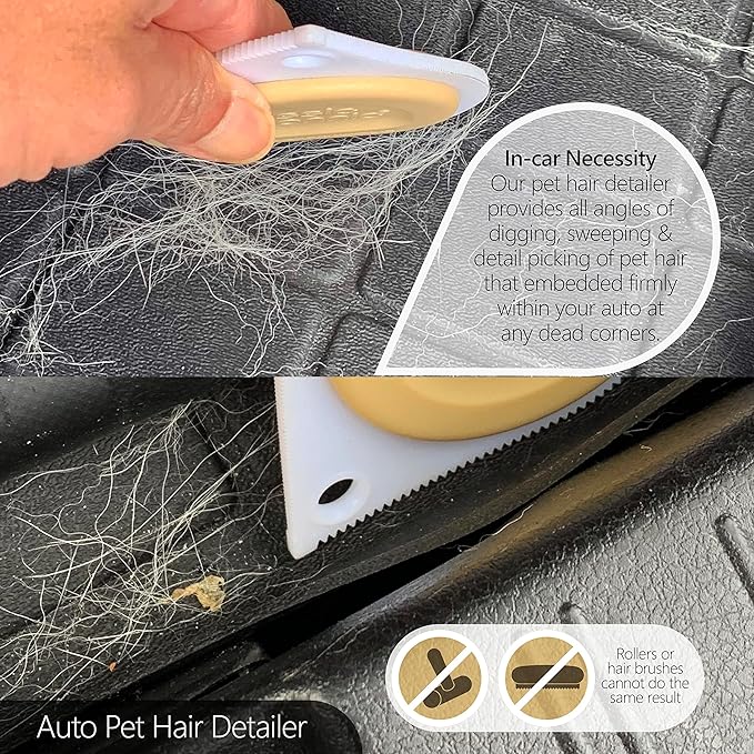 - HARD-TO-REACH EDGE SWEEPING REMOVER. Our uniquely angled design dog cat auto detailer with dual-sided teeth effortlessly tackles animal fur in tight spots like sofa gaps, car seats, and benches. This advanced auto interior detailer swiftly removes embedded hair from car mats and fabric furniture faster than vacuuming alone. The soft yet durable plastic blade ensures safe use on various surfaces.