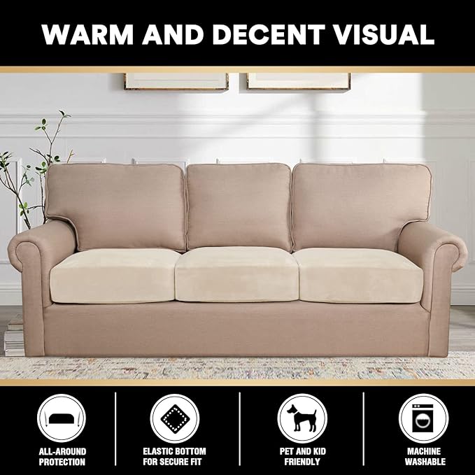PrinceDeco Stretch Sofa Cushion Covers for Couches and Sofas,Soft Velvet Couch Seat Covers, Sofa Covers Washable, Seat Cushion Cover for 3 Couch Sofa Pet Friendly - Ivory, Each Width Up to 29.5"