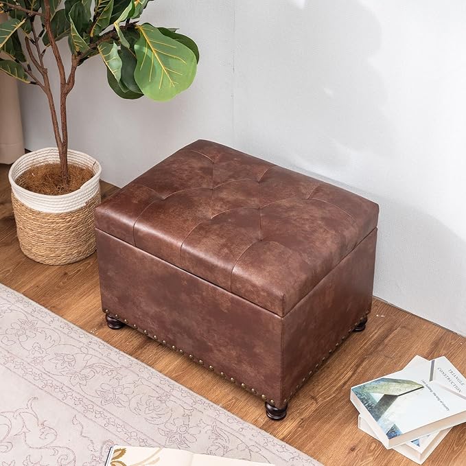 - STYLISH DESIGN CONCEPT: Soft Leathaire fabric, upholstered tufted top, wood frame, red brown wooden legs, bronze rivet gives this ottoman a rich, luxurious look to any room in the house.