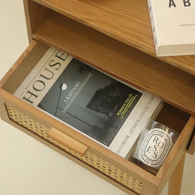 - Stylish and Practical Storage: The bedside table features a two-tier storage design, a unique extra top shelf and a spacious tabletop with a natural rattan drawer to fit your snug home and provide more space to put down books, snacks, drinks