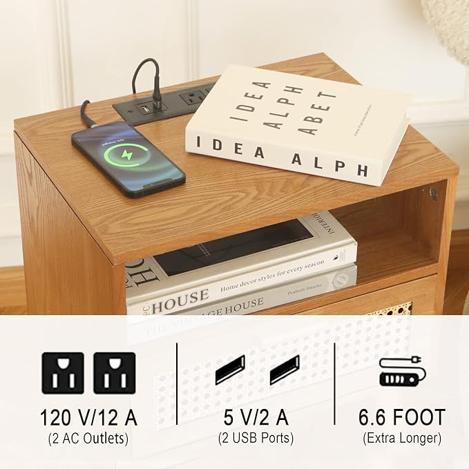 - Bedside Tables with Charging Station: The plug contains 2 3-Prong Power outlets and 2 USB ports. It's easy to charge your phone, computer, any electric device etc. The power cod is 6.6 ft long, everything is within your arm's reach