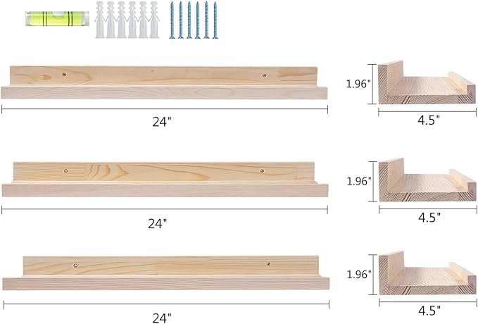 - Wall Mounted Floating Shelves Size: 24 inch x 4.5 inch x 1.8 inch (L x W x H), a set of 3 natural wooden floating shelves. Wall ledge shelves are sturdy enough to hold your favorite collections, family photos, kids’ books, decorative items, cosmetics or green plants.