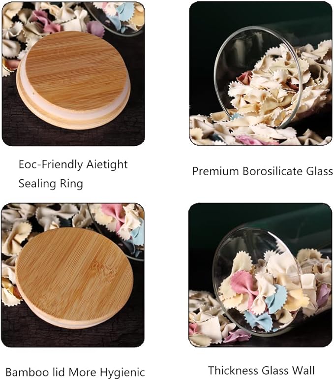 - 【Keep Your Food Fresh】 Glass jars with bamboo lids, airtight with a harmless silicone loop around the wood cover, create a moistureproof environment to keep your dry food inside clean and fresh, locking out air moisture and bugs.