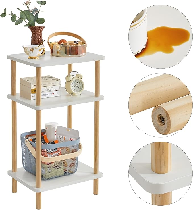 IBUYKE 3-Tier Side Table, Solid Wood Tall End Table with Storage Shelves, Nightstand Bedside Table for Living Room Bedroom Office, No-Tool Assembly, White UWST003W