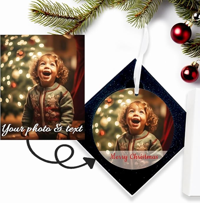 - Create a Truly Unique Keepsake – Upload your favorite photo and add custom text to design a one-of-a-kind ornament that celebrates any milestone: weddings, engagements, baby's first Christmas, new home, family memories, or special achievements.