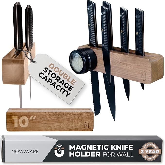 - 2 ROWS OF STORAGE – Discover a new way to organize your kitchen with our patented 10” wood magnetic knife holder. Boasting two rows of storage capacity to fit any collection of knives plus utensils, this magnetic knife strip allows you to maximize your usable space in a limited kitchen. The extra thick wooden base features an inner knife slip that when combined with the 10” magnetic wooden face allows you to safely store over 10 knives and utensils in one convenient location.