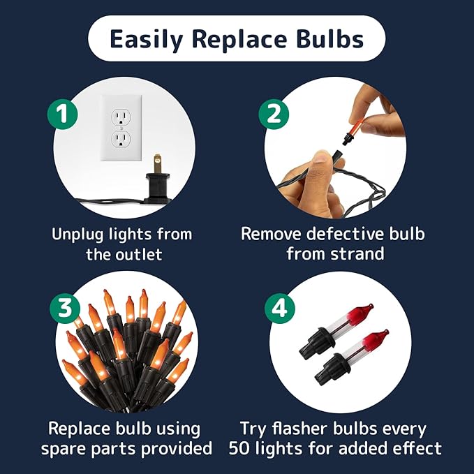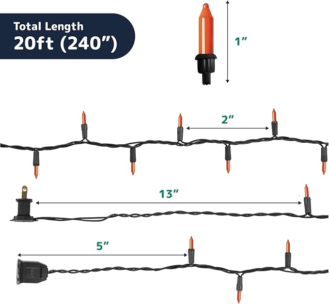 - INCLUSION - 20 feet of 100 orange lights on a black wire, along with 2 flasher bulbs for a twinkling effect, 2 extra bulbs for convenience, and 2 replacement fuses (2F/2R/1) for long-lasting use