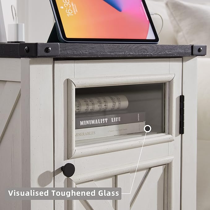 JXQTLINGMU Farmhouse End Table with Charging Station, 18'' Rustic Nightstand with Barn Door & Adjustable Shelf, Wooden Sofa Side Table with 3-Tier Storage for Living Room, Bedroom, White