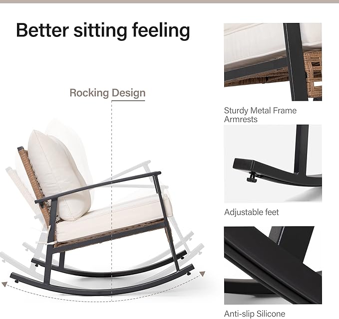 - 【Durable Metal & Rattan Frame】Compared with other ordinary rattan, the frame of this patio bistro set is made of sturdy metal and rattan material. The widened rattan has a hollow design, which is simple and fashionable. Additionally, the powder-coated metal rocking chairs and tables are built to be rust-resistant. This patio wicker rocking chair set can withstand rain, sun exposure, and wind effortlessly.