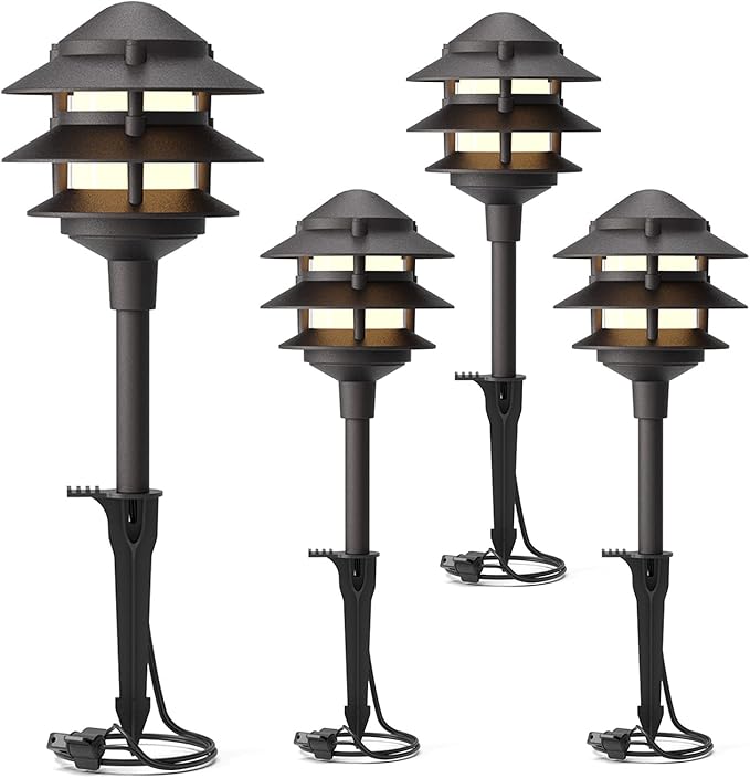 - ✔4PK 12V AC PATHWAY LIGHTS: These 4PK low voltage path lights use 2.2 watt led chips with 30 lumen brightness. You will like the 3 tier pagoda shape, a refreshing option from other shaped landscape lights