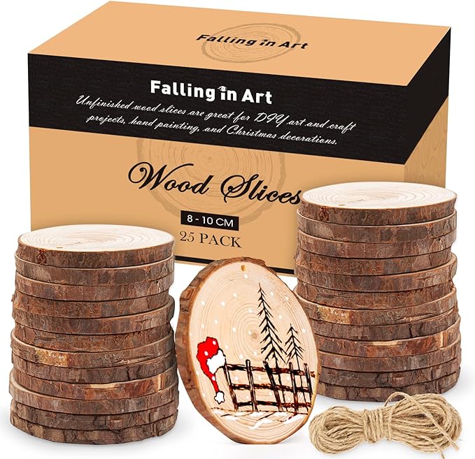 - DIY Projects: Falling in Art natural wood slices are suitable for various art and craft projects, hand painting, photo transfer, pyrography, background wall decoration, Christmas ornaments, and wedding centerpiece settings. Hang them with twine, then you can create a special scene.