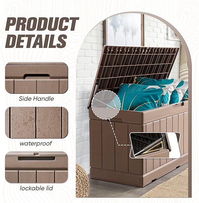 - 【Suitable Storage Space】This 83 gallon lockable outdoor storage box is suitable for any corner of your home, you can store cushions, garden equipment or use it as an outdoor parcel drop box, it can make your house and backyard more neat and beautiful, meanwhile, the lockable function can protect your items safely.