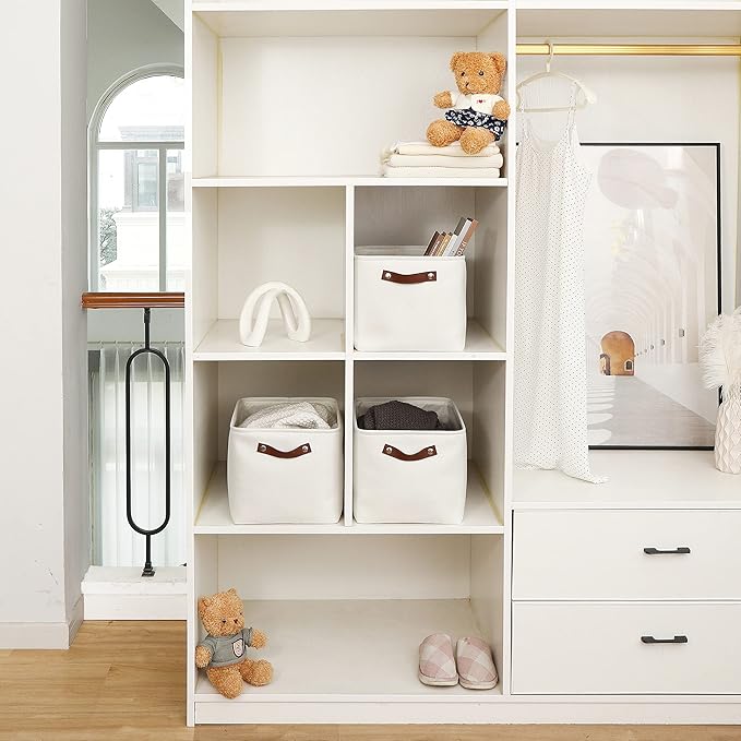 - Decorative Fabric and Vegan Leather – These versatile storage baskets for organizing your everyday life are made with a thick, high-quality fabric and fitted with leather handles to add a stylish touch to a living room, bedroom, office, or personal space.