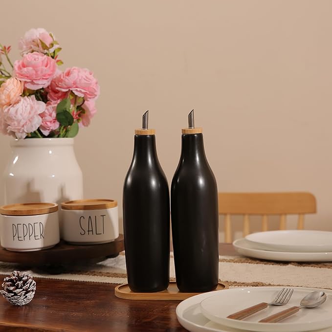 - Ceramic Oil Dispenser Bottles: Set of 2 includes 16.9oz ceramic oil bottles with stainless steel spouts and bamboo trays for easy organization.