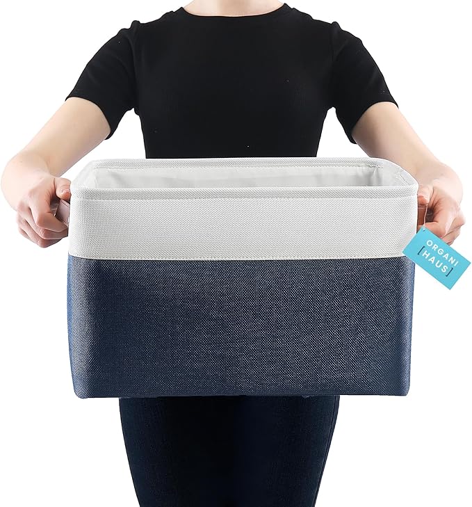 OrganiHaus Extra Large Fabric Storage Bins for Shelves 16x13in, Closet Storage Baskets for Shelf Organizing, Canvas Rectangle Bins for Organization, Linnen Baskets for Organizing - Navy Blue/White
