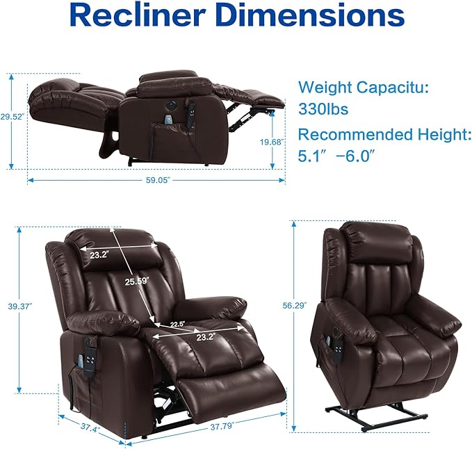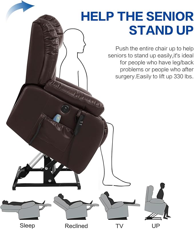 - 【Heating and Massage】The lift chair has eight massage points; three massage modes, the waist has a heating system that can provide waist care and heating for the elderly or other people in need; at the same time, the temperature-controlled heating system, 113℉~140℉, when it reaches 140℉, it will automatically cut off the power and continue to cool down to 113℉ before heating.