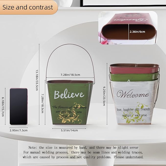 - [Size]Set of 3 metal hanging wall planters, top: 7.2'' x 2.4'', height: 7.4'', handle: 5.6''. Notice: Artificial flowers and plants are not included.