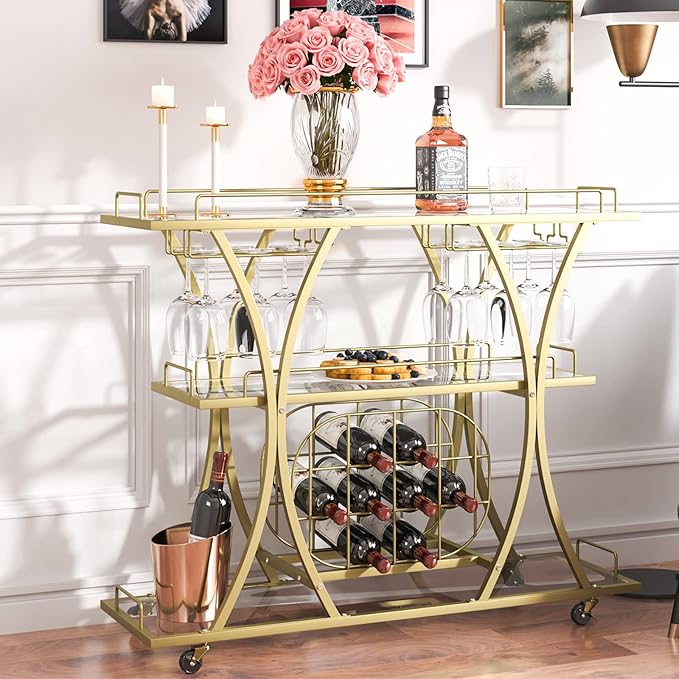 - 【FLEXIBLE WHEELS FOR EASY MOVE】 - The gold bar cart has two 360° rotating casters and two brake casters, which can be stopped as needed without accidental sliding, caster wheels make it easy to move the bar cart from one place to another. Meeting your daily mobility needs.