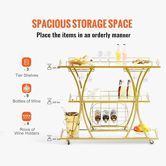 VEVOR Bar Cart Gold, 3 Tiers Home Bar Serving Cart on Lockable Wheels, Rolling Alcohol Cart with Tempered Glass Shelves Guardrail Wine Rack, Modern Wine Cart for Home Kitchen Dining and Living Room