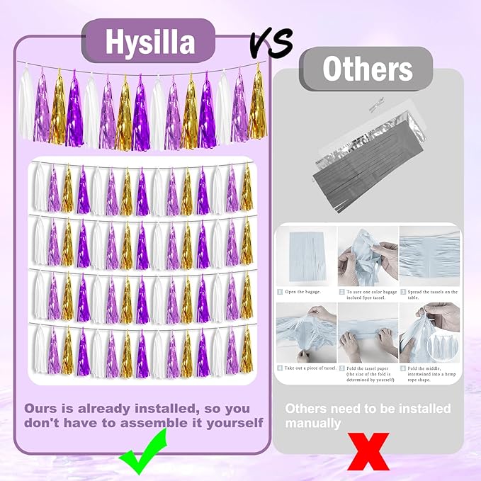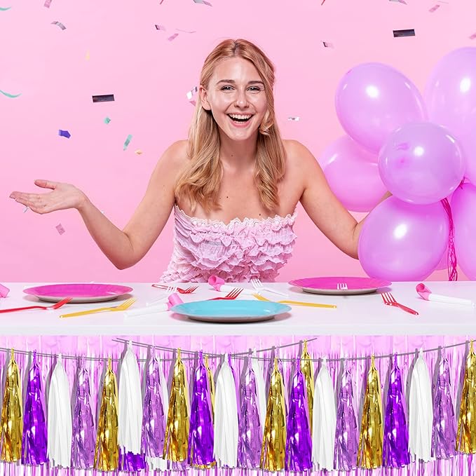 - 【White Light Purple Purple Gold Party Supplies Set】: The total length of the white light purple purple gold birthday tassels banner is 26.2 feet, divided into 4 strips, each 6.5 feet long. Each banner contains 15 tassels, and each tassel measures 14 inches, for birthday decorations many occasions, and so on