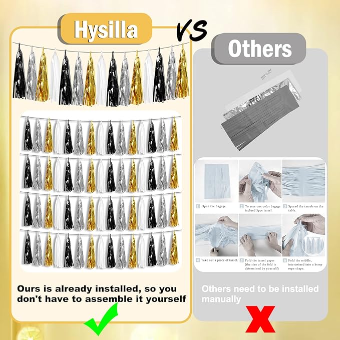 - 【Black Silver Gold White Party Supplies Set】: The total length of the Black Silver Gold White birthday tassels banner is 26.2 feet, divided into 4 strips, each 6.5 feet long. Each banner contains 15 tassels, and each tassel measures 14 inches, for birthday decorations many occasions, and so on