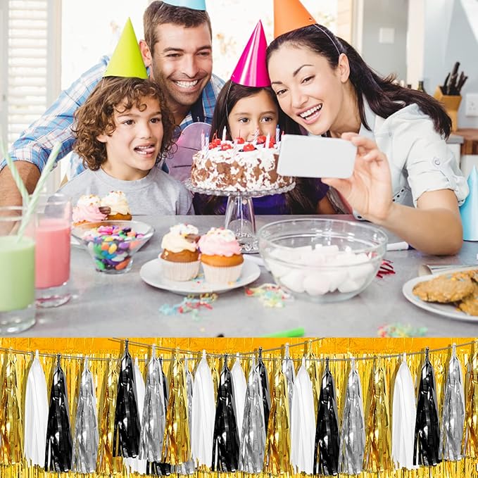 - 【Perfect Party Decoration】The Black Silver Gold White tinsel garlands are designed in a metallic Fringe, bright, and beautiful, at the same time, they shine in the sun, and these gorgeous tassel garlands create a wonderful backdrop or centerpiece for your party space. and bring you, your family, and your friend's good Visual effects. your party many emotional and touching moments where a lot of pictures will be taken and everybody will have a wonderful time together.