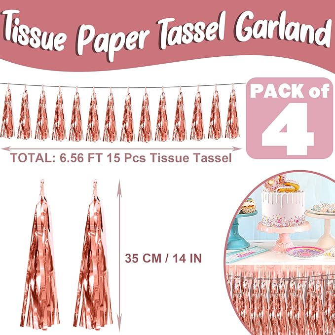 - 【Rose Gold Party Supplies Set】: The total length of the rose gold birthday tassels banner is 26.2 feet, divided into 4 strips, each 6.5 feet long. Each banner contains 15 tassels, and each tassel measures 14 inches, for birthday decorations many occasions, and so on