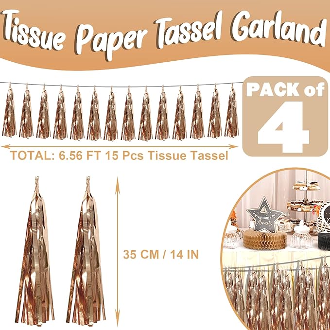 - 【Champagne Party Supplies Set】: The total length of the champagne birthday tassels banner is 39.3 feet, divided into 4 strips, each 9.8 feet long. Each banner contains 15 tassels, and each tassel measures 14 inches, for birthday decorations many occasions, and so on