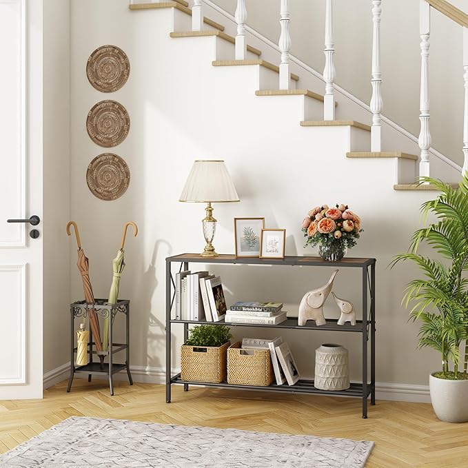 Hoctieon Industrial Console Table, 3 Tier Entryway Table, Hallway Table, Narrow Sofa Table with Shelves, Entrance Table for Entryway, Rustic Brown&Black