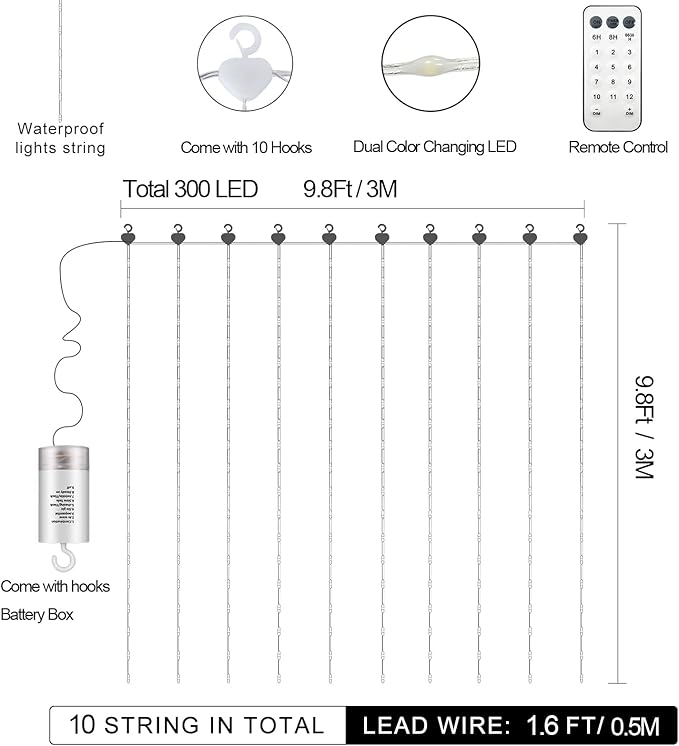 - Dual Color Changing Curtain Lights: Each LED bead has 2 glowing pieces, a total of 300 high-quality SMD LEDs. Change modes and brightness using the remote