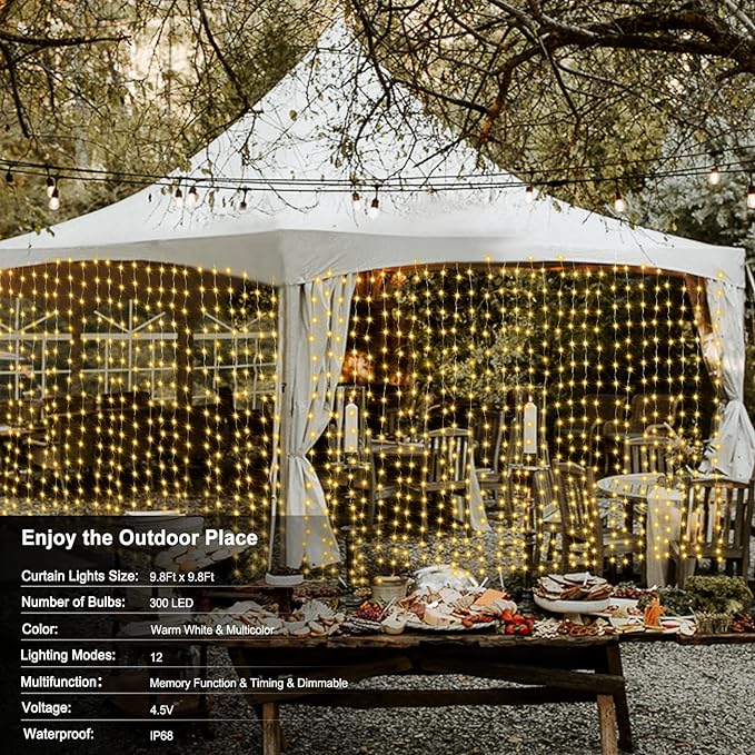 300 LED Fairy Curtain Lights 2 Color Changing, 9.8Ft x 9.8Ft Hanging Lights Battery Operated with Hooks, Outdoor Curtain Light Waterproof for Party Backdrop Patio Decorations (Warm White & Color)