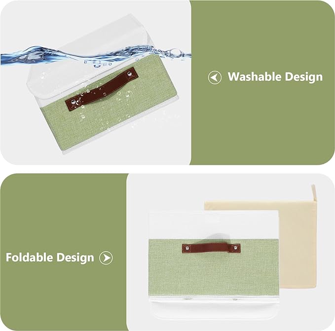 ANMINY 2PCS Storage Boxes with Lid Washable Decorative Storage Bins Basket with PU Leather Handle Foldable Linen Fabric Storage Cubes Containers for Home Closet Organizer - Green White, Large Size