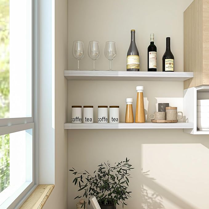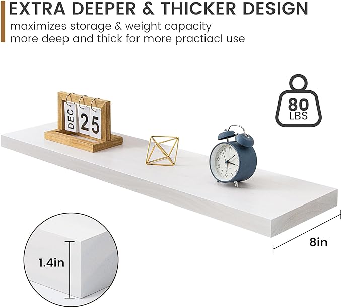 - Extra Deeper & Thicker for Storage - Each board measures 36"W x 8"D x 1.4"H. Extra deeper and thicker design in order to bring maximizes storage space and weight capacity, even hold up to 60 lb. This floating shelf taking up zero square feet, reduces clutter and highlights décor in compact spaces. It can help make full use of the empty wall, making it much more space-saving and making your room look larger and tidier.