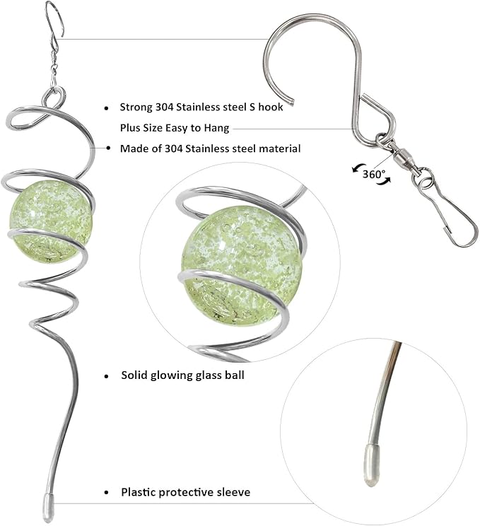 - 【Unique Visual Illusion Spiral Design】The gazing ball spiral tail is an unique hanging ornament ,Also it can help to stabilize 3D wind spinners or yard decor from swing when it rotate.When the spiral tail rotates to the left, the glass ball seems to move upwards,when the spiral tail rotates to the right, the glass ball seems to moves downward,the glass ball seems to like floating and dancing in air, presenting a magical optical illusion!It doesn't shine in the daytime,It needs to glow in the dark.