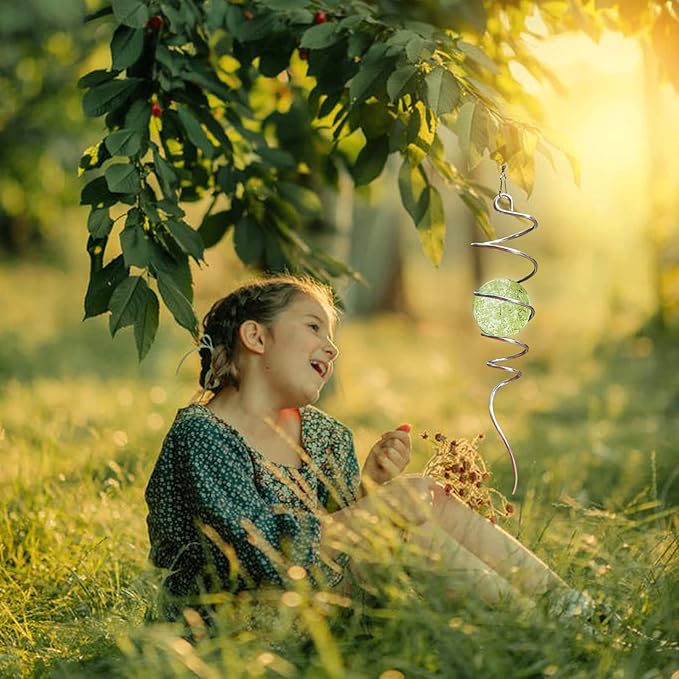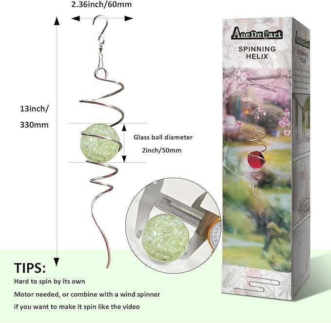 - 【Easy To Position】The Wind Spinner Stabilizer Spiral can't spin by itself ,if you want to make it spin like the video ,need add 1pc motor (not include) ,or combine it with a wind spinner or any rotatable hanging ornament to help it rotate. Come with 1pc 2 inch colored glass orb(not paint), 1pc silver color spiral tail twister,and 1pc swivel hook accessory, ready to hang and enjoy.