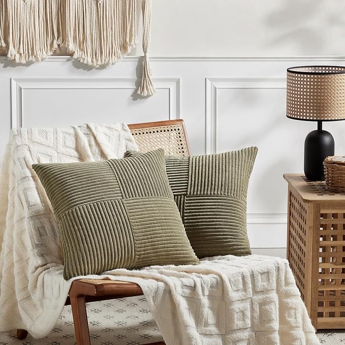 Fancy Homi 2 Packs Olive Green Decorative Throw Pillow Covers 16x16 Inch for Living Room Couch Bed, Rustic Farmhouse Boho Home Decor, Soft Corss Patchwork Corduroy Textured Cushion Case 40x40 cm