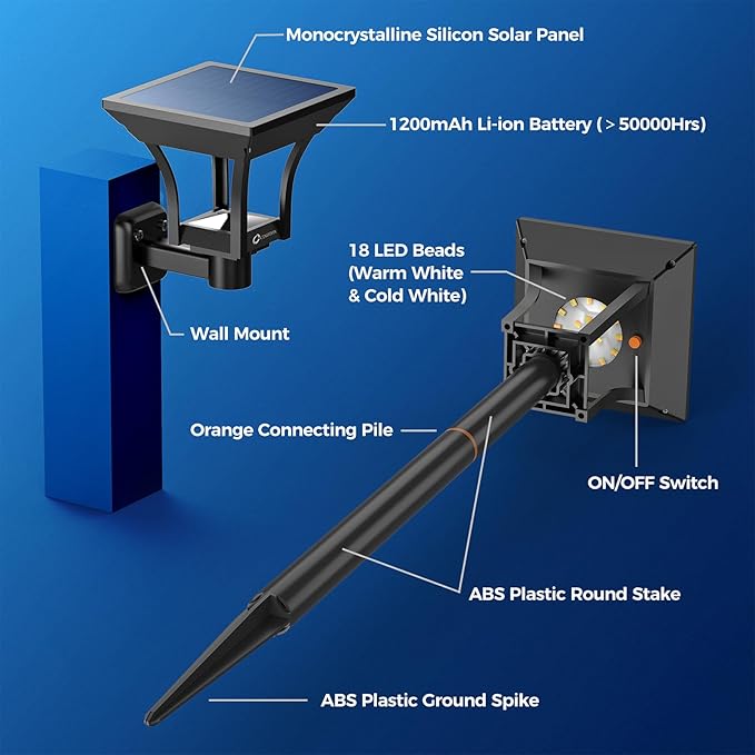 - 【IP65 Waterproof & Long-lasting】Made of ABS plastic and reaching the sealing process with an IP65 waterproof rating, our solar powered outdoor lights are designed to withstand most weather conditions, such as sunny, rainy, frosty, sleet or light snowy days for multi-season outside use.
